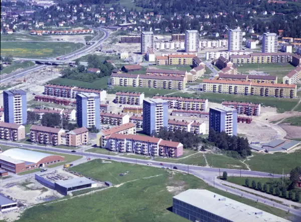 I front Sandstuveien fra høyre og Ryensvingen fra venstre. Enebakkveien med boligblokker i Raukeveien og Havreveien. Rugveien, Våronnveien og Plogveien. Ringveien oppe til venstre. (Flyfoto)