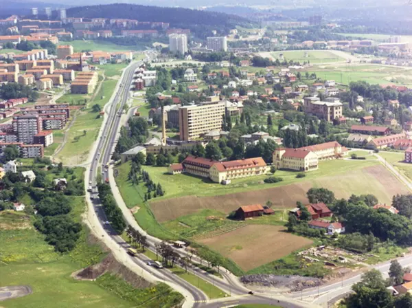 Sinsenkrysset (i front) med Trondheimsveien og Ringveien . Nordre Sinsen gård nærmest krysset. Aker sykehus foran villabebyggelse på Refstad. Boligblokker på Disen til venstre for Trondheimsveien. (Flyfoto)
