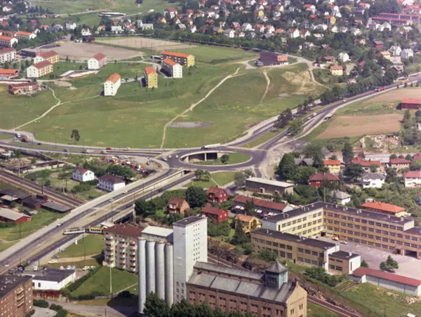 Sinsenkrysset, med Trondheimsveien og Ringveien (mot venstre). Sinsen kornsilo foran Sinsen skole. Jernbanesporet til Gjøvikbanen går mellom disse. Boligblokker og villabebyggelse på Disen i bakgrunnen. (Flyfoto)