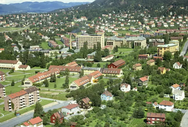 Aker sykehus midt på bildet. Sinsenveien nede fra venstre, med villabebyggelse på Refstad i front. Boligområde på Disen og Lofthus i bakgrunnen. (Flyfoto)