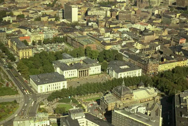 Universitetet i Oslo, med Nationaltheateret i front. Fredriks gate krysser Karl Johans gate til venstre. Nasjonalgalleriet ved Tullinløkka i bakgrunnen. (Flyfoto)