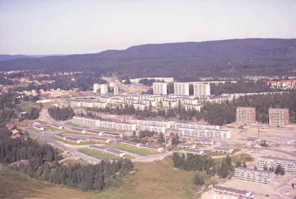 Rekkehus i Bogerudveien og Bogerudslyngen. General Ruges vei går bak rekkehusene. Stallerudveien ved høyblokkene til høyre. Bøler i bakgrunnen. (Flyfoto)
