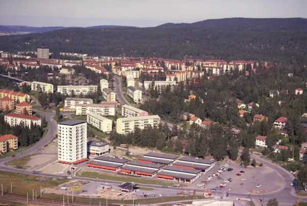 Oppsal senter. Haakon Tveters vei i front, Skøyenåsveien til venstre og Vetlandsveien til høyre. Trikkesporet til Østensjøbanen helt nederst til venstre. (Flyfoto)
