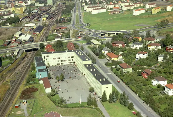 Sinsen skole. Jernbanesporet til Gjøvikbanen til venstre og Lørenveien til høyre for skolen. Trondheimsveien og Ringveien møttes i Sinsenkrysset lenger bak. Grefsen jernbanestasjon og boligblokker på Disen i bakgrunnen. (Flyfoto)