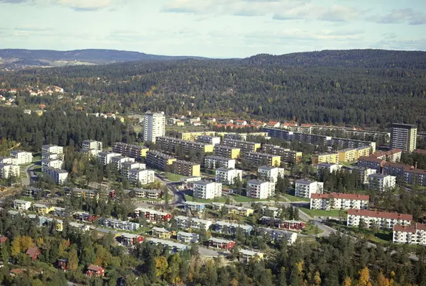 Rekkehus i Sveiserveien, Klinkerveien og Solbergliveien. Skøyenåsveien til høyre. Boligblokker i Mekanikerveien, Filerveien og Kranveien lenger bak.(Flyfoto)