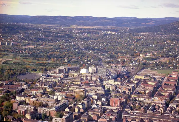Bogstadveien og Ole Vigs gate i front. Midt på bildet sees kuppelen til Colosseum kino. Frogner stadion og Frognerparken til venstre. I bakgrunnen går Sørkedalsveien med Heggeli på venstre og Borgen på høyre side. (Flyfoto)