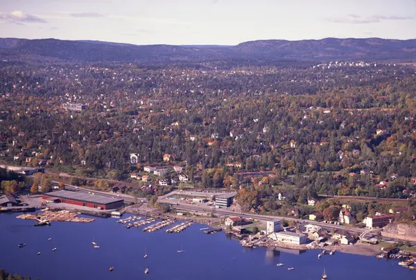 Bestumkilen med Drammensveien og jernbanesporet til Drammenbanen bak. Løvenskiold-Vækerø (Maxbo) til venstre, Maritim til høyre. Lilleaker og Ullern i bakgrunnen. (Flyfoto)