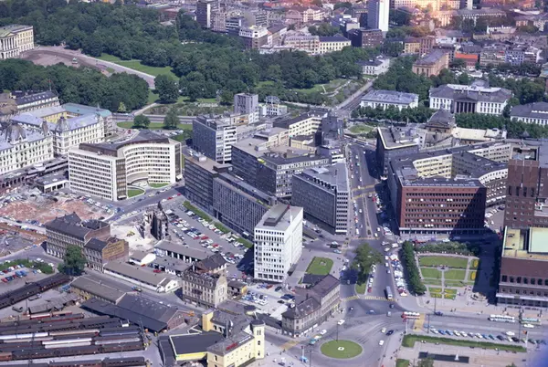 Vestbanestasjonen og Enga til venstre, Rådhuset og Rådhusplassen til høyre. Olav V`s gate til venstre for Råduset. Victoria terrasse og Slottsparken i bakgrunnen. (Flyfoto)
