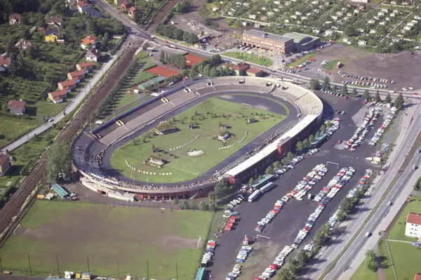 Ullevål stadion, hvor Jehovas Vidner her har møte. Trikkesporet til Sognsvannsbanen og Bergslia til venstre, Ringveien til høyre og Sognsveien bak stadion. (Flyfoto)