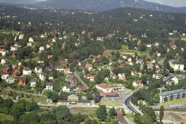 Trikkesporet til Lilleakerbanen krysser Lilleakerveien i front. Sponhoggveien går bak trikkesporet, og Guvernørens vei til venstre for forretningsbygget. Ullernåsen i bakgrunnen. (Flyfoto)