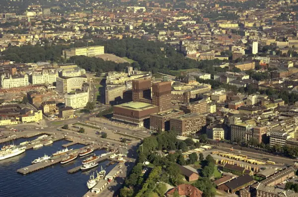 Rådhuset med Rådhusplassen og Pipervika foran. Vestbanestasjonen til venstre. Rådhusgata og Parkeringsplass for busser på Kontraskjæret til høyre. Slottet og Slottsparken i bakgrunnen. (Flyfoto)