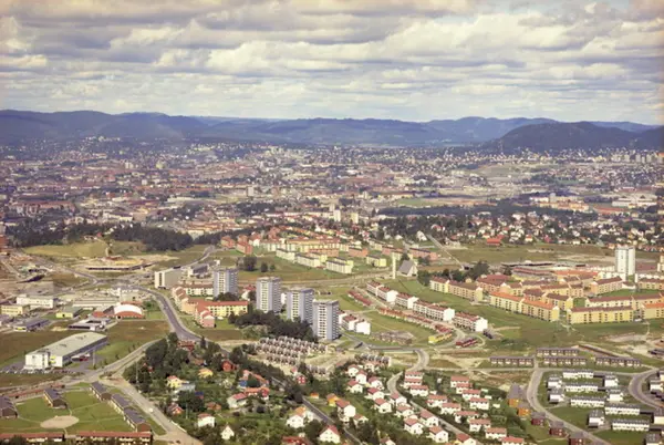 Sandstuveien, Høgdaveien, Enebakkveien, Vekterveien og Skigardveien fra venstre i front. Philipsbygget, og industriområde i Ryensvingen til venstre, Boligblokker i Rugveien til høyre. Høyblokker i Havreveien og Manglerud kirke midt på bildet. (Flyfoto)
