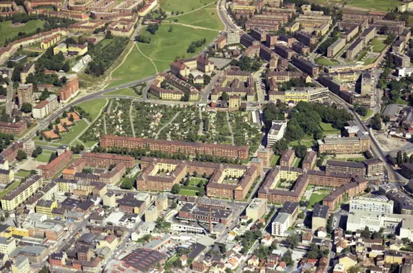 Stockholmgata, Gøteborggata, Fjellgata og Langgata fra venstre i front. Rodeløkka kolonihager midt på bildet, med Christian Michelsens gate og Dælenenggata i front. Fagerheimgata og Trondheimsveien møttes øverst i bildet. (Flyfoto)