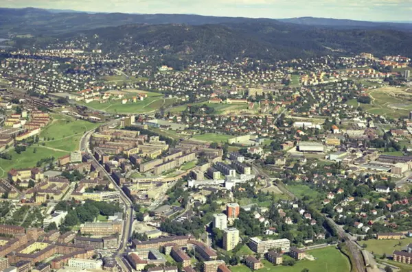 Trondheimsveien og Carl Berners plass i front. Jernbanesporet til Gjøvikbanen i bro over Grenseveien til høyre. Sinsenkrysset og Aker sykehus i bakgrunnen. (Flyfoto)