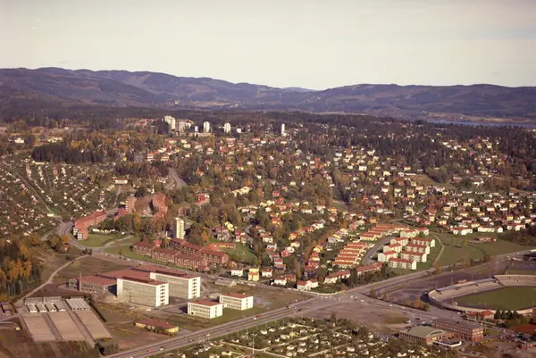 Ringveien nede fra venstre, krysser Sognsveien. Sogn videregående skole til venstre, Ullevål stadion til høyre. Sogn hagekoloni helt i front, Solvang hagekoloni til venstre. Nordberg i bakgrunnen. (Flyfoto)