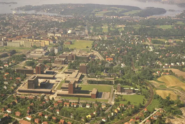 Universitetet i Oslo. Meteorologisk institutt til høyre. Niels Henrik Abels vei, Eventyrveien og Tyrihansveien i front. Trikkesporet til Sognsvannsbanen til høyre. Marienlyst og Majorstua i bakgrunnen. (Flyfoto)