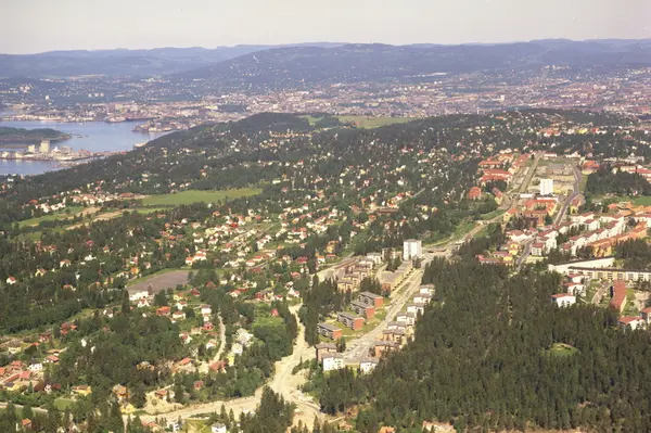Nordstrandveien og Langbølgen i front. Nordstrandshallen ved idrettsplassen til venstre. Nordseter i bakgrunnen til venstre. Lambertseter senter, T-banesporet til Lamberseterbanen og Cecilie Thoresens vei i bakgrunnen til høyre. (Flyfoto)