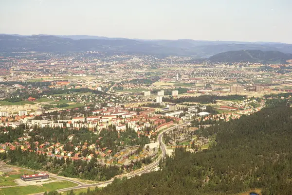 Hellerudveien og Østmarkveien i front. Firemannsboliger i Eftasåsen og Tyristubbveien lenger bak. Rekkehus i Unnarennet mot høyre. Godlia og Tveita i bakgrunnen. (Flyfoto)
