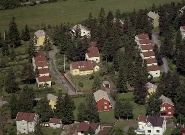 Rekkehus til venstre ligger langs Morenestien. Til høyre Maurstien. Rekkehusene er oppført i 1947-49. Begge tverrveiene går mellom Korsvollbråtan og Åmotveien. Havnajordet kan sees bortenfor Åmotveien. (Flyfoto)