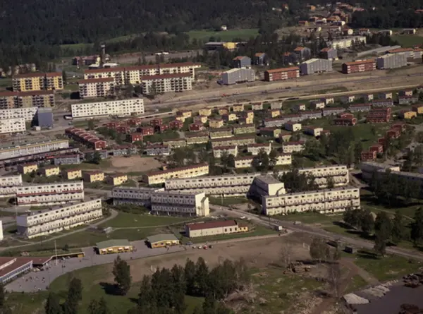 Drabantby - boligblokker og småhusbebyggelse Veitvet. I front to gule hus - paviljongene til Veitvet skole, startet i 1957. Veitvetveien. Til venstre for pavlijongene Veitvet skole, bygget i 1958. Sletteløkka på oversiden av Trondheimsveien. Veitvet hageby. Til høyre er Apaløkka mot Rødtvedt. Beverveien. (Flyfoto)