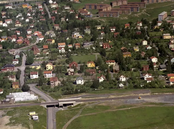 Risløkka T-banestasjon under bygging. Risløkkalleen går under broen. Første husrekke ligger til Risløkkveien Midtveien. Lekeplassveien. Sverre Refstads plass.Nederst til venstre der Biltilsynet ligger i dag. Krokliveien øverst til høyre. Økernliveien øverst til venstre. (Flyfoto)