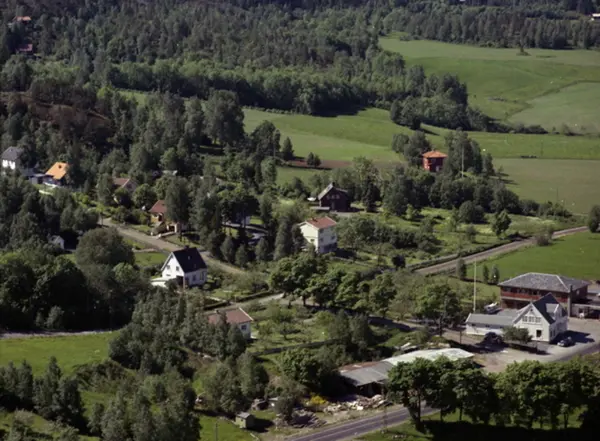 Strømsveien med butikk. Grønliveien oppover til venstre. Midt i bildet går Gamle Strømsveien. I bakgrunnen ses noen av jordene til Jeriko gård. (Flyfoto)