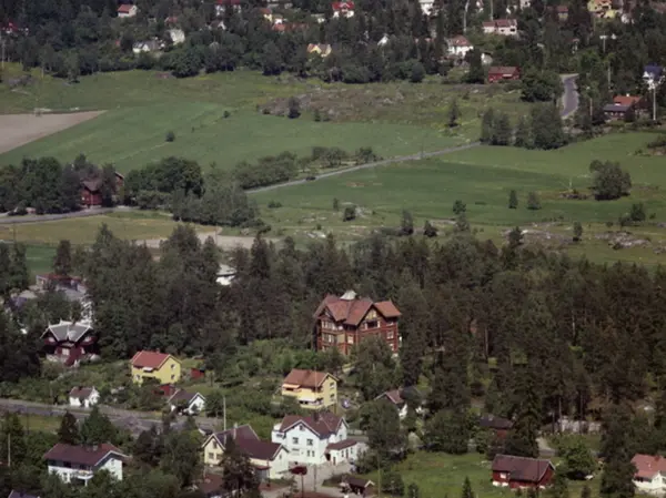 I front Bråten holdeplass på Ekebergbanen og forretningsbygg (revet) ved Ekebergveien. Nordseter gård, bak til venstre. Lambertseterveien over Nordseterjordene. (Flyfoto)
