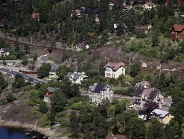 Mosseveien og Furubråtveien ved jernbaneundergangen. Østfoldbanen (jernbanelinje). Krysset til Nordstrandsveien helt til høyre. Lyst, lite hus med grått skråtak (Mosseveien 188) var Nordstrand politistasjon (revet). Bak skimtes stall og arrestlokale som står fremdeles. (Flyfoto)