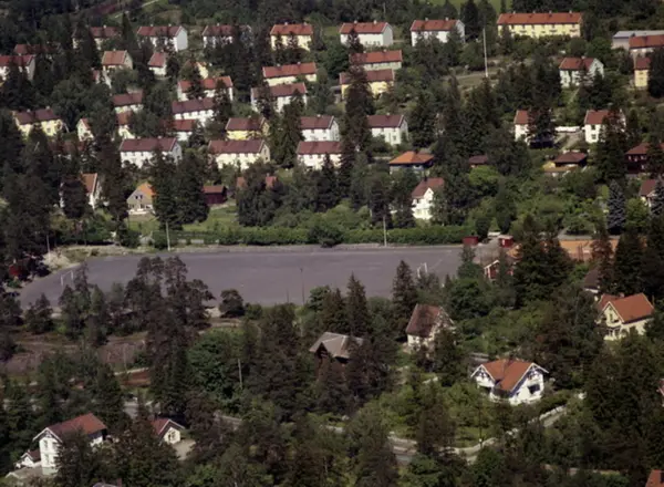 Jomfrubråtveien bak Sportsplassen. Ekebergsletta i bakgrunnen. Ekebergbanens sidespor til Simensbråten (nedlagt 1967) skimtes bak til venstre. (Flyfoto)