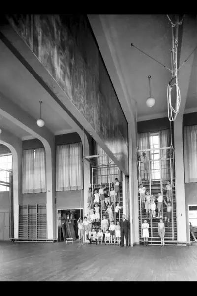 Barn i ribbevegg, oppstillt for fotografen? Trykkfeil i bildetittel - skal være gymnastikksalen. Møllergatens skoles utvidelse, 1933 (albumtittel) (Møllergata skole)
