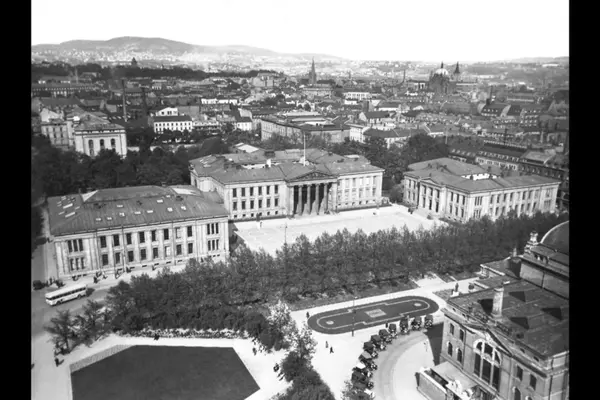 Studenterlunden, Nationaltheateret. Bildet er sannsynligvis tatt fra Stortingsgata 28 (Odd Fellow-bygningen). Datering basert på grunnlag av A-20031/U/005/019.