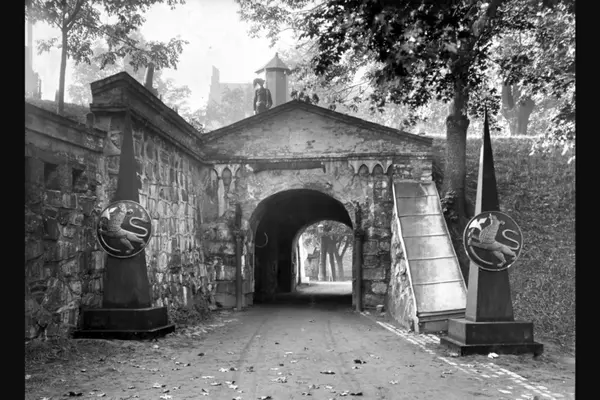 Søyler med riksvåpenet / riksløve som markerer inngangen til utstillingen ved Øvre Vollport på Akershus festning. For mer informasjon om jubileumsutstillingen - se artikkel i Tobias nr 1, 2000