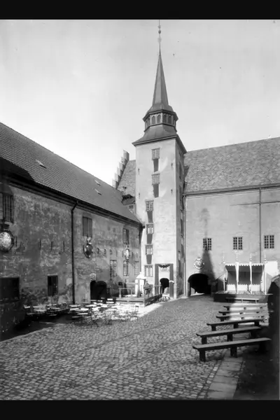 Inne i borggården på Akershus festning. Musikktribune, benker, uteservering. For mer informasjon om jubileumsutstillingen - se artikkel i Tobias nr 1, 2000