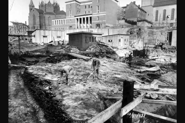 Grunnarbeide ved bygging av Oslo Hovedbrannstasjon. Arbeidsbrakker. Trefoldighetskirken, Deichmanske hovedbibliotek og Margaretakyrkan (Svenska kyrkan) i bakgrunnen foran Henrik Ibsens gate. Albumtittel: "Oslo hovedbrannstasjon" (eg. identisk bildetittel til alle bildene i albumet)