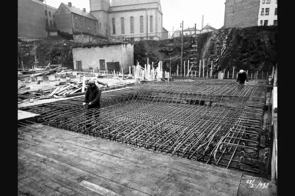 Bygging av grunnfundament til stasjonen. Legging av armeringsjern. Margaretakyrkan (Svenska kyrkan) i bakgrunnen. Albumtittel: "Oslo hovedbrannstasjon" (eg. identisk bildetittel til alle bildene i albumet)