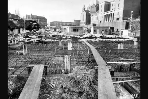 Fra byggingen av hovedbrannstasjonen. Grunnsokkel / Kjelleretasje. Arbeidsbrakker. Trefoldighetskirken og Deichmanske hovedbibliotek bak til høyre. Bebyggelse langs Akersgata bakerst.