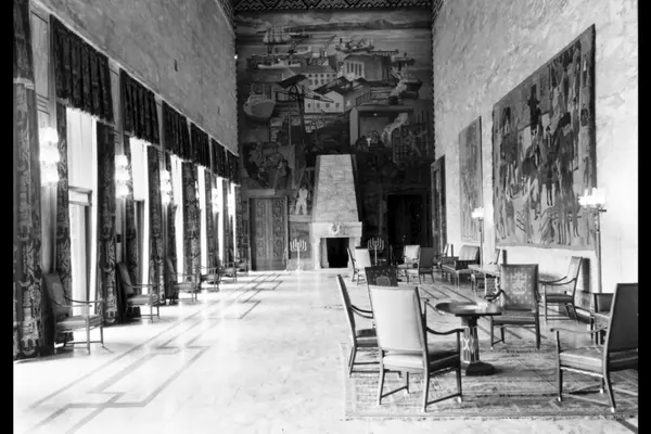 Oslo Rådhus (Rådhuset). Festgalleriet med Axel Revolds freskomaleri "Skipsfarten og industrien" (på vestveggen i bakgrunnen) og Kåre Mikkelsen Jonsborgs veggteppe "Lilletorget" til høyre. (Jfr. bilde A-20031/U/0012/007 og 008)