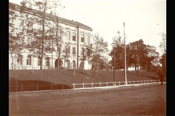 Statuen "Mannen med nøkkelen" av Auguste Rodin fra 1902. Sommerroparken. Bebyggelse i Sommerrogata. Drammensveien i forgrunnen. Bildet er datert 7/8-02.
