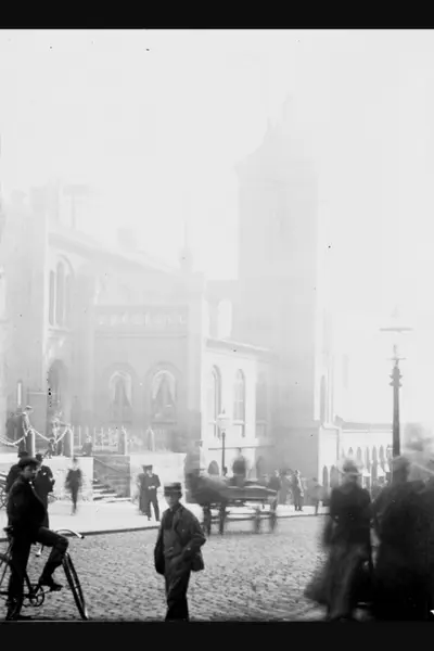 Basarene, Kirkeristen og Brannvakten (fra 1856) med tårnet sett fra Karl Johans gate. Gateliv, gutt på sykkel, hest og kjerre. Bildet datert 22. september 1903