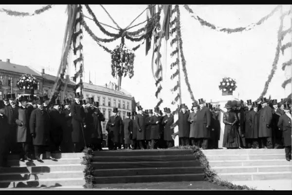 Fra Bjørnstjerne Bjørnsons begravelse. Utlagt løper på øvre trapp fra bryggen. Nobiliteter med flosshatter venter på prosesjonen. Kong Haakon 7. til venstre for løperen. Girlandere og sørgeflor. Bygårder langs Sjøgaten i bakgrunnen.