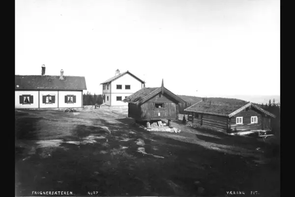 Fra Thomas Heftyes tidligere landsted på Frognerseteren, overtatt av Oslo kommune i 1889. I midten stabbur oppført i 1868, til høyre "Torkjellstuen", flyttet i 1884 fra Nyhus, Ål i Hallingdal, bak i midten hovedbygningen, oppført i 1866, til venstre forvalterboligen, flyttet og sammenbygget med ny restauratørbolig i 1900.