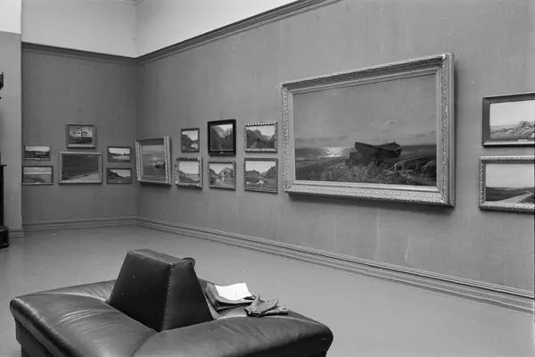 Fra Amaldus Nielsens malerisamling i Oslo Kunstforenings lokaler på St. Olavs plass 5. (Gitt som gave til Oslo kommune fra familien i 1933, idag plassert på Stenersenmuseet.) Gallerisofa.