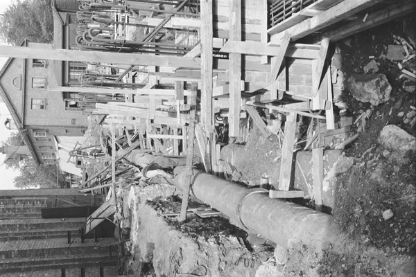 Byggeplass. Graving. Armering. Forskaling. Bygging av nytt retortanlegg (ovner der kull ble oppvarmet for å avgi gass) til Gassverket. Legging av gassrør.
