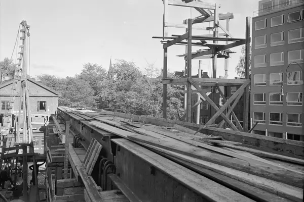 Byggeplass. Jernbjelker. Reisverk. Bygging av nytt retortanlegg (ovner der kull ble oppvarmet for å avgi gass) til Gassverket. Høyhus i Storgata 38 (Blå Korshuset) til høyre.