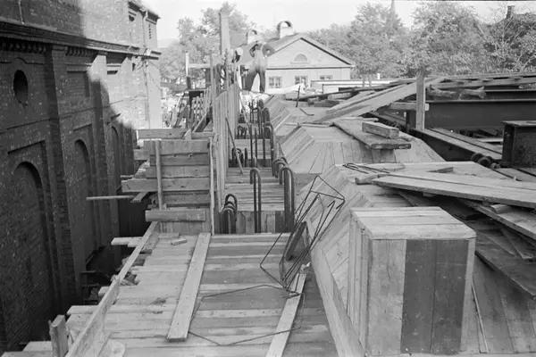 Byggeplass. Jernbjelker. Jernbinding. Forskaling. Gassverkets teglsteinsbygning til høyre. Bygging av nytt retortanlegg (ovner der kull ble oppvarmet for å avgi gass) til Gassverket.