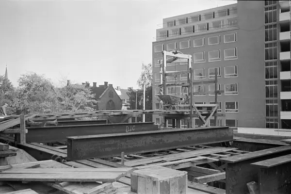 Byggeplass. Jernbjelker. Reisverk. Bygging av nytt retortanlegg (ovner der kull ble oppvarmet for å avgi gass) til Gassverket. Høyhus i Storgata 38 (Blå Korshuset) til høyre. Krohgstøtten sykehus bak i midten.