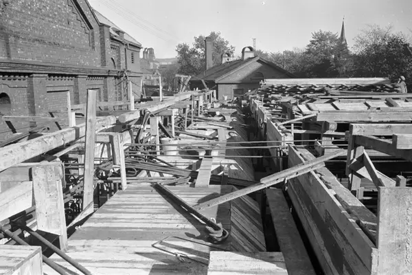 Byggeplass. Armering. Jernbinding. Forskaling. Gassverkets teglsteinsbygning til høyre, kontorbygg i bakgrunnen. Bygging av nytt retortanlegg (ovner der kull ble oppvarmet for å avgi gass) til Gassverket.