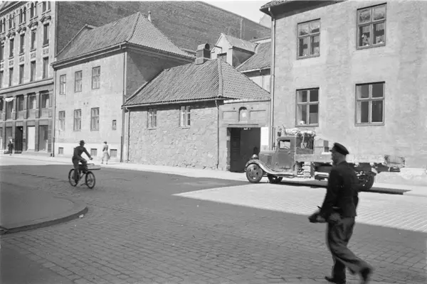 Garmanngården i Rådhusgata 7 til høyre, byens andre rådhus (1734-1843). Fredet, en av Oslos eldste bevarte bygninger (eldste bygningsdel fra 1625). Rådhusgata 7C i midten, 7B til venstre. Mann på sykkel, lastebil.