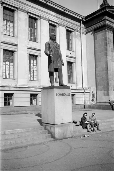Julius Middelthuns bronsestatue (avduket 1883) av jusprofessor og politiker Anton Martin Schweigaard foran Midtbygningen (Domus Media) på Universitetsplassen.