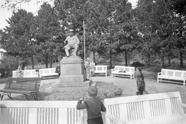 Brynjulf Bergsliens portrettstatue (avduket 1891) av eventyrforfatteren Peter Christen Asbjørnsen. Plassert i bakken over Festplassen. Park. Parkbenker.